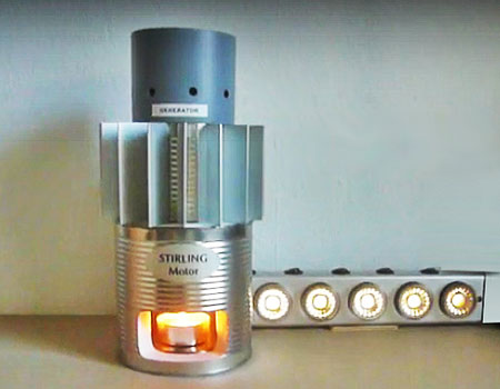 Schulungsmodell für Stirlingmotor Ein findiger Modellbauer aus Österreich hat das Modell eines Stirlingmotors mit Freikolbentechnik gebaut. Der Motor funktioniert ohne bewegliche Teile mit einem einzigen Kolben. Er treibt mit der Energie eines kleinen Teelichtes über einen Lineargenerator eine LED-Lampe über 24 Stunden an. Näheres über dieses Schulungsmodel und seinen faszinierenden Erfinder finden Sie unter www.stirlingmotoren.at und im → Video |